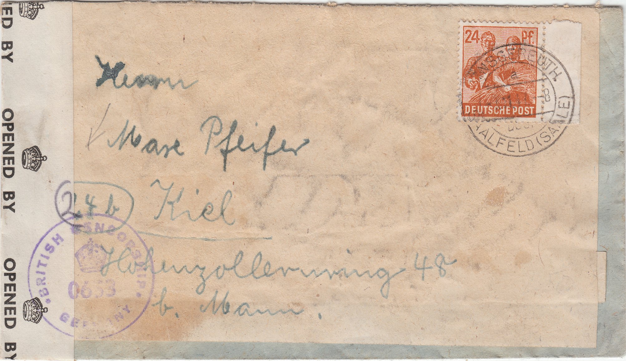 In Deutschland angekommen lief der Brief durch die britische Zensurstelle, wo er linksseitig geöffnet und mit einem Verschlußstreifen "P.C. 90 OPENED BY EXAMINER 4726" wieder verschlossen wurde, was ein vorderseitig abgeschlagener Prüfstempel "BRITISH CENSORSHIP GERMANY 3244" in Violett dokumentiert.