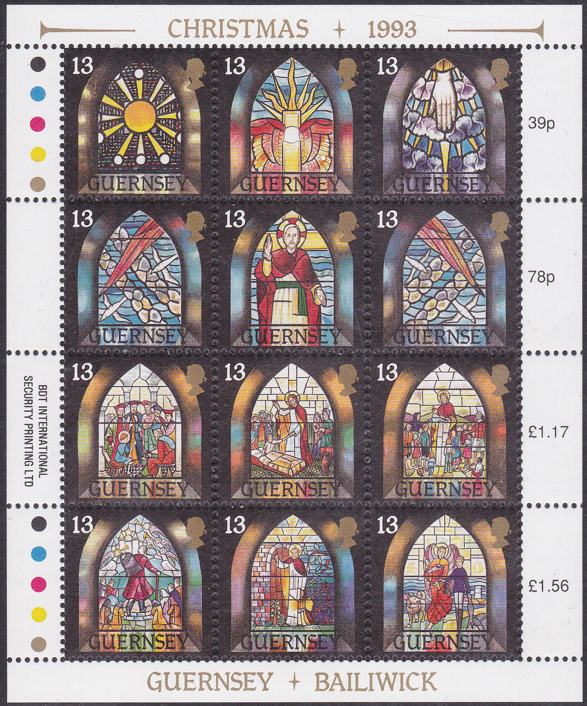 Die zwölf Marken zu je 13 Pence wurden zusammenhängend in einem Kleinbogen gedruckt. Hier ein kompletter Kleinbogen: