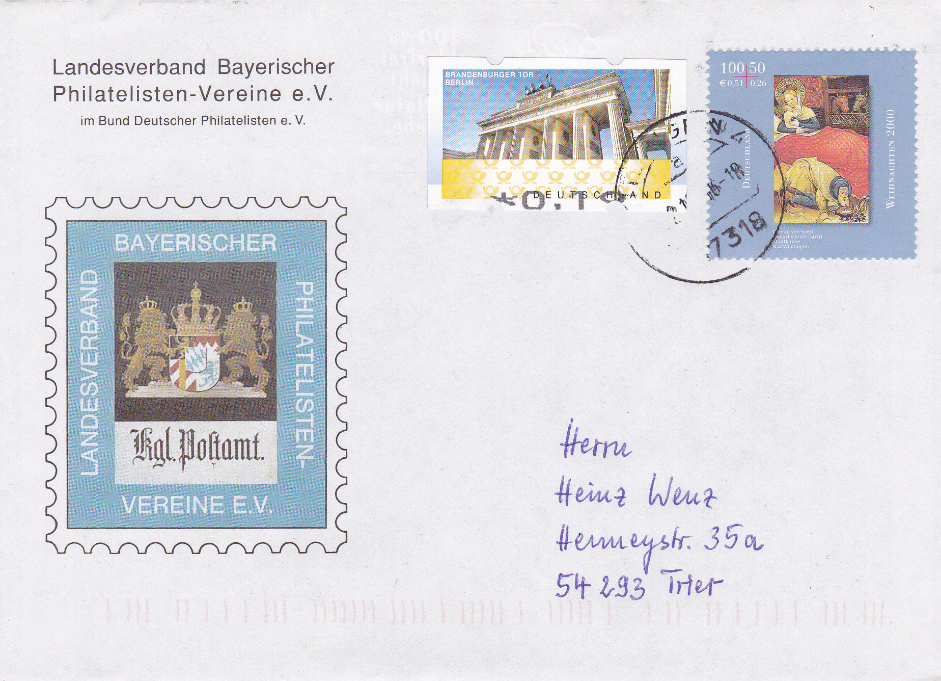 Diese Weihnachtsmarke der Deutschen Post AG aus dem Jahre 2000 (MiNr 2124) mit der Abbildung des Gemäldes "Geburt Christi" der Meister des Krainburger Altars wurde auf diesem Brief mit entsprechender Zusatzfrankatur erst im Jahre 2016 verwendet.