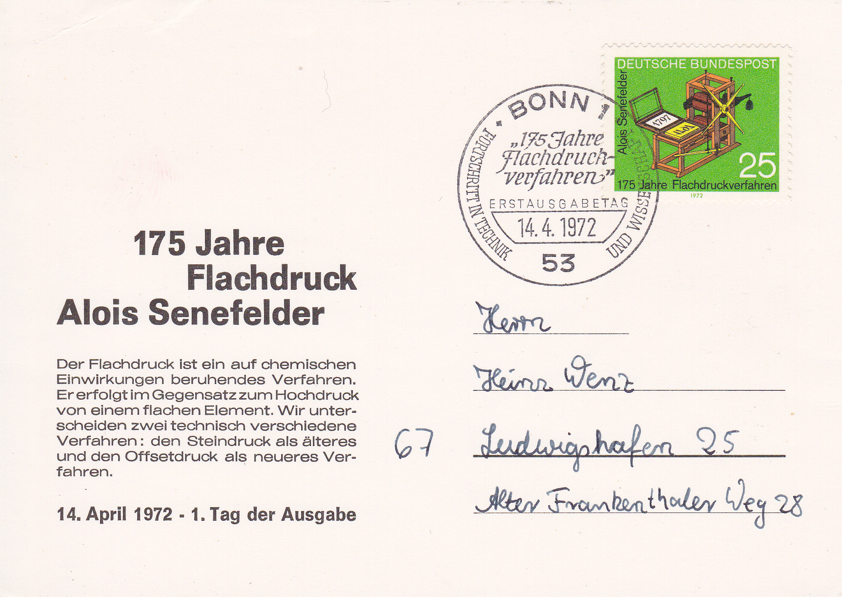 Auf dieser Postkarte per Einschreiben sind portogerecht fünf Marken "175 Jahre Flachdruckverfahren" verkebt. Das Porto betrug für die Postkarte 25Pf und die Zusatzleistung Einschreiben 100Pf, zusammen aslo 125Pf. Die Postkarte wurde am Ersttag der Marke mit einem Sonderstempel in Mainz abgestempelt und mit einem Sonder-R-Zettel zur Briefmarkenausstellung MABRIA 1972 beklebt.