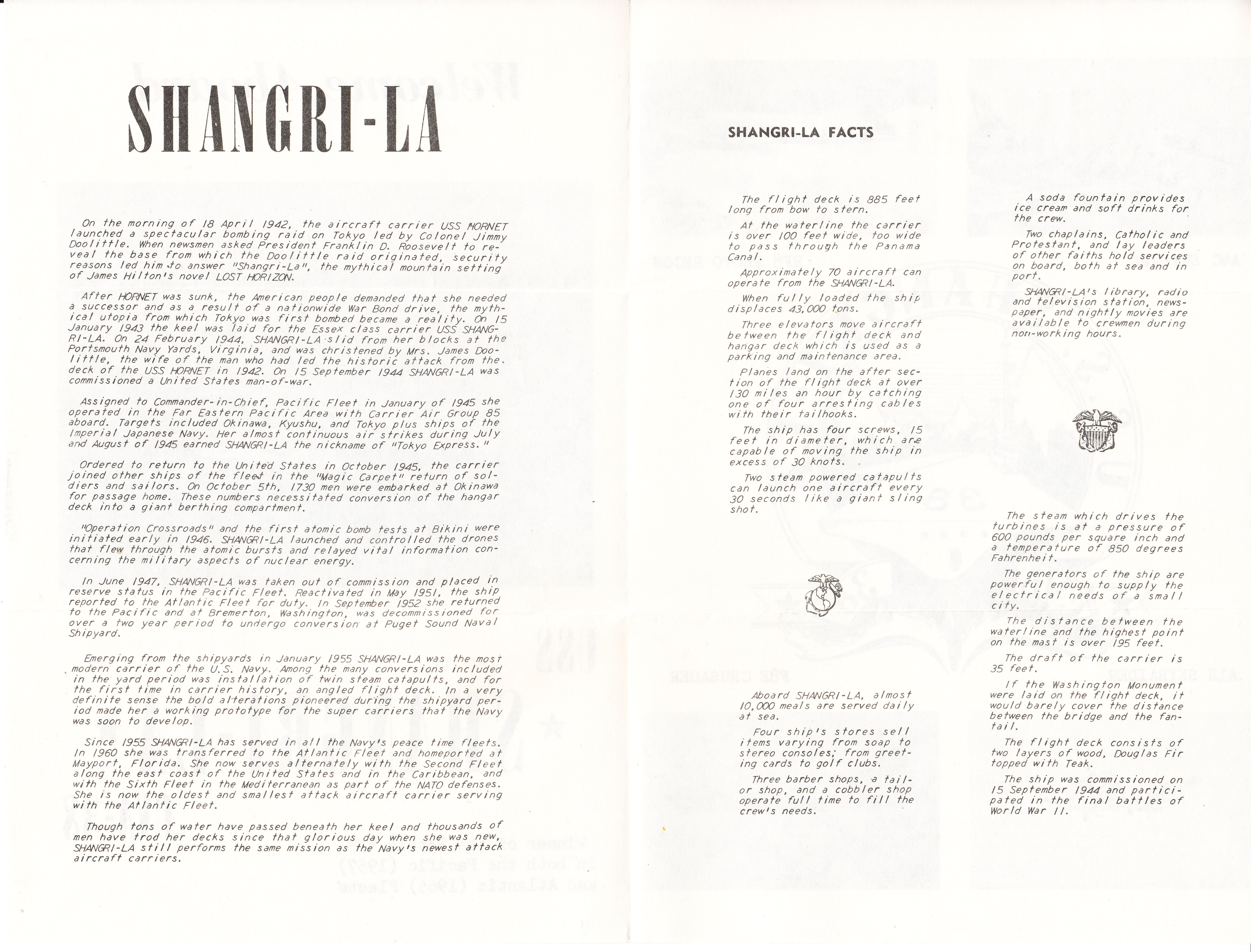Solche etwa DIN A4 großen, beidseitig bedruckten und einmal gefalteten Flyer wie dieser der "USS *SHANGRI-LA* CVA"-38 passen sehr gut zu diesem Sammelgebiet, denn sie geben hilfreiche Informationen zum jeweiligen Schiff, die sich in einer thematischen Sammlung verarbeten lassen, aber seht selbst:
