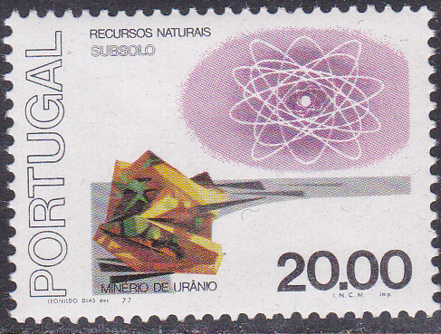 Auf dieser Marke aus einer Serie "Bodenschätze" (MiNr 1373) werden Uranerz und ein Atommodell des Urans gezeigt.