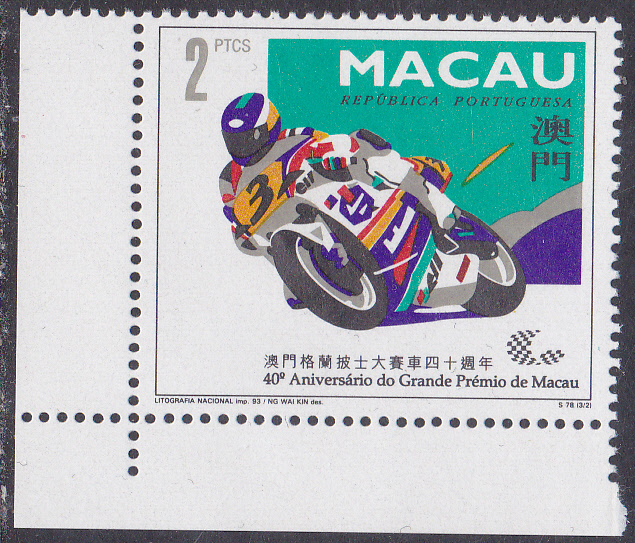 Die zweite Marke (MiNr 744) widmet sich den Motorradrennen und zeigt eine Straßen-Rennmaschine.