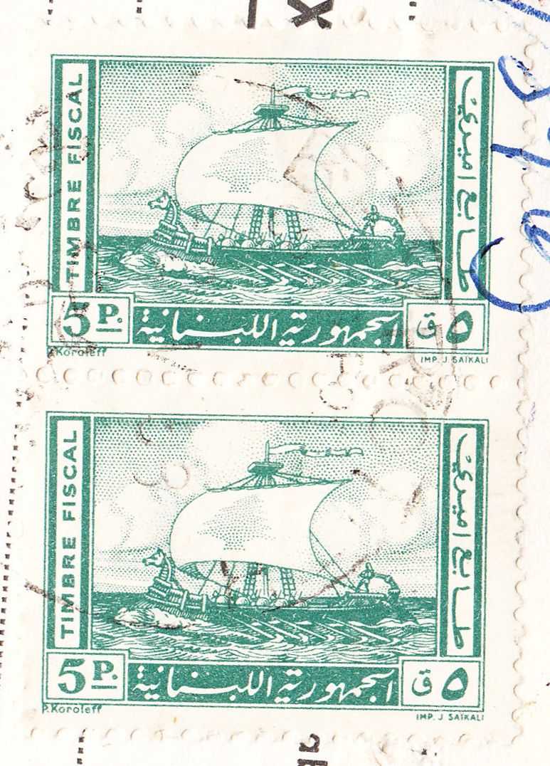 Hier eine Mehrfachfrankatur einer Fiskalmarke aus dem Libanon auf einer Paketkarte am 02.06.1958:
