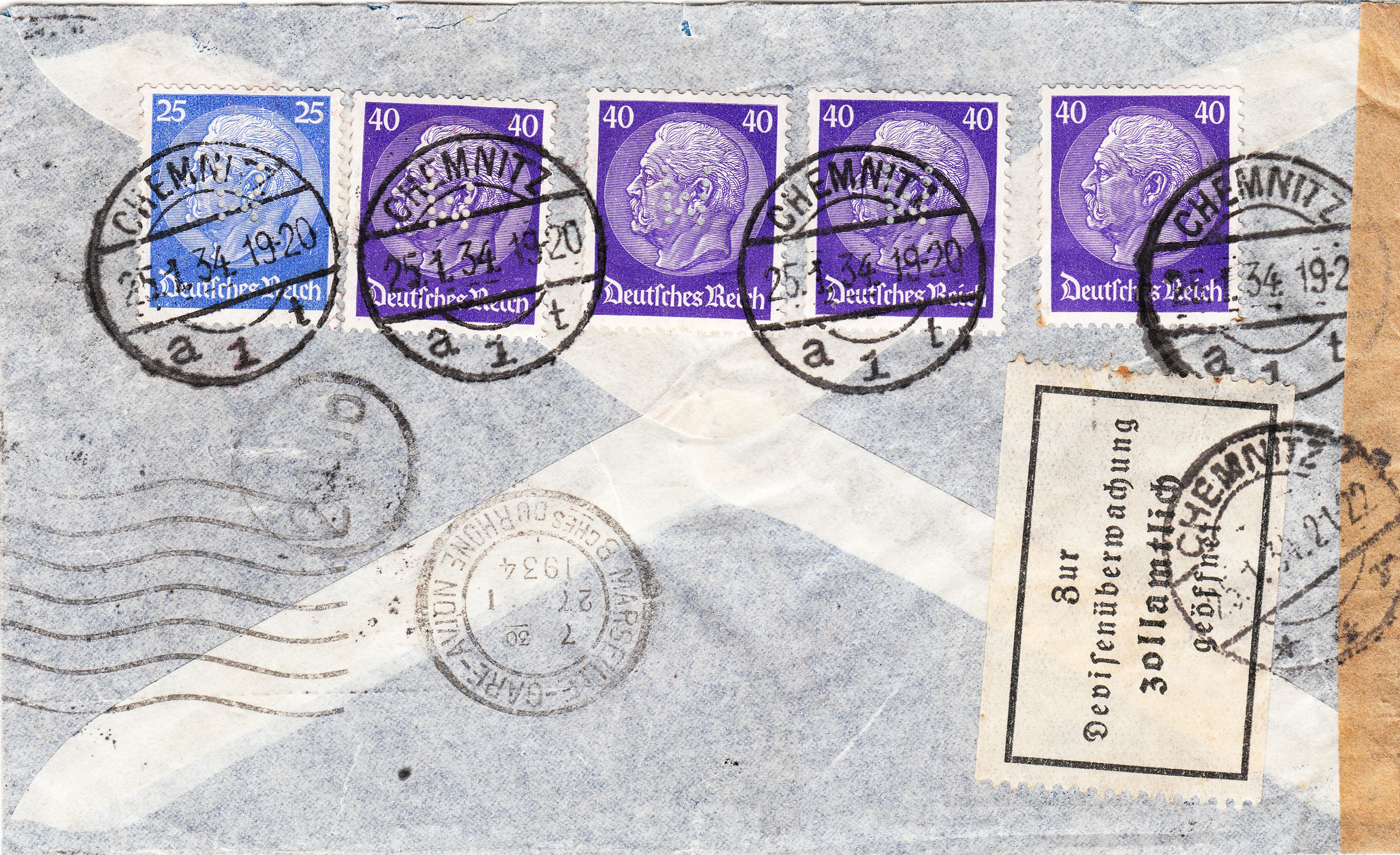 Dieser am 25.01.1934 in Chemnitz aufgegebene Brief nach Buenos Aires in Argentinien sollte "Durch Luftpost Frankreich-Südamerika" befördert werden und wurde mit Postwertzeichen der Dauerserie frankiert, die bis auf eines eine Firmenlochung "W" der in Chemnitz ansässigen Firma C. H. WEISBACH tragen: