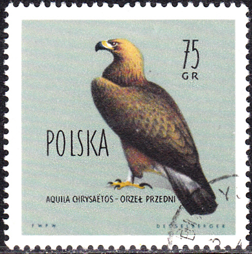 Ein weiterer Steinadler (Aquila chrysaetos) ist auf dieser Marke aus Polen (MiNr 1203) in einer Serie "Geschützte Vögel Polens" abgebildet.