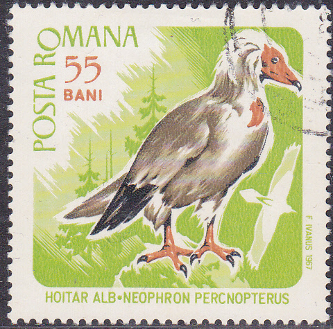 Ein weiterer Schmutzgeier (Neophron percnopterus) ist auf dieser Marke aus Rumänien (MiNr 2571) zu sehen. Die Marke zeigt auch sein Fluigbild.