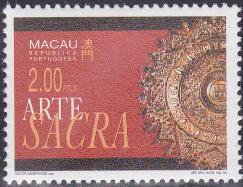 Inn Macau erschien am 30. Nov. 1994 eine Serie "Religiöse Kunst". Hier eine Marke aus der Serie (MiNr 779) mit der Abbildung "Engelshaupt" aus einem Buntglasfenster.