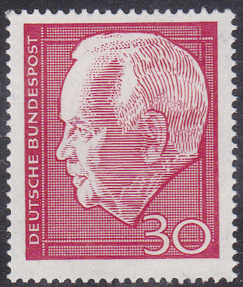 Die Marken zur Wiederwahl von Heinrich Lübke erschienen auch mit der zusätzlichen Inschrift "Berlin" bei der LPD Berlin. Hier die Marke zu 20Pf (MiNr 234) aus dem Jahre 1964.