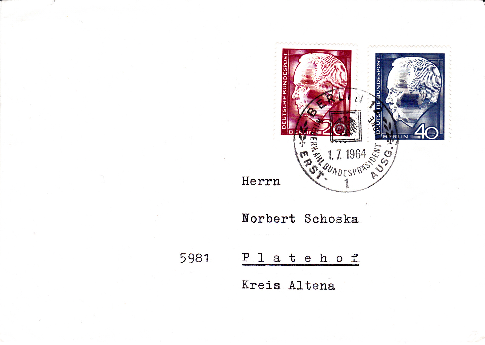 Satzbrief vom Ersttag der beiden Berliner Marken zur Wiederwahl von Heinrich Lübke mit der zusätzlichen Inschrift "Berlin" und dem Ersttagstempel Berlin.