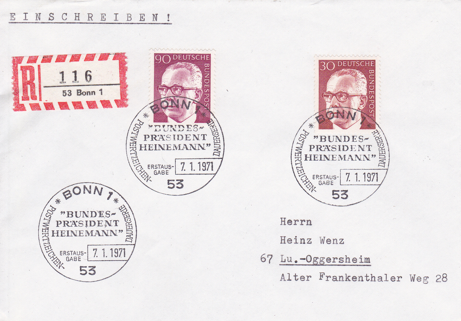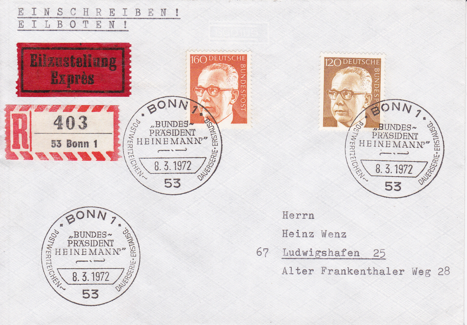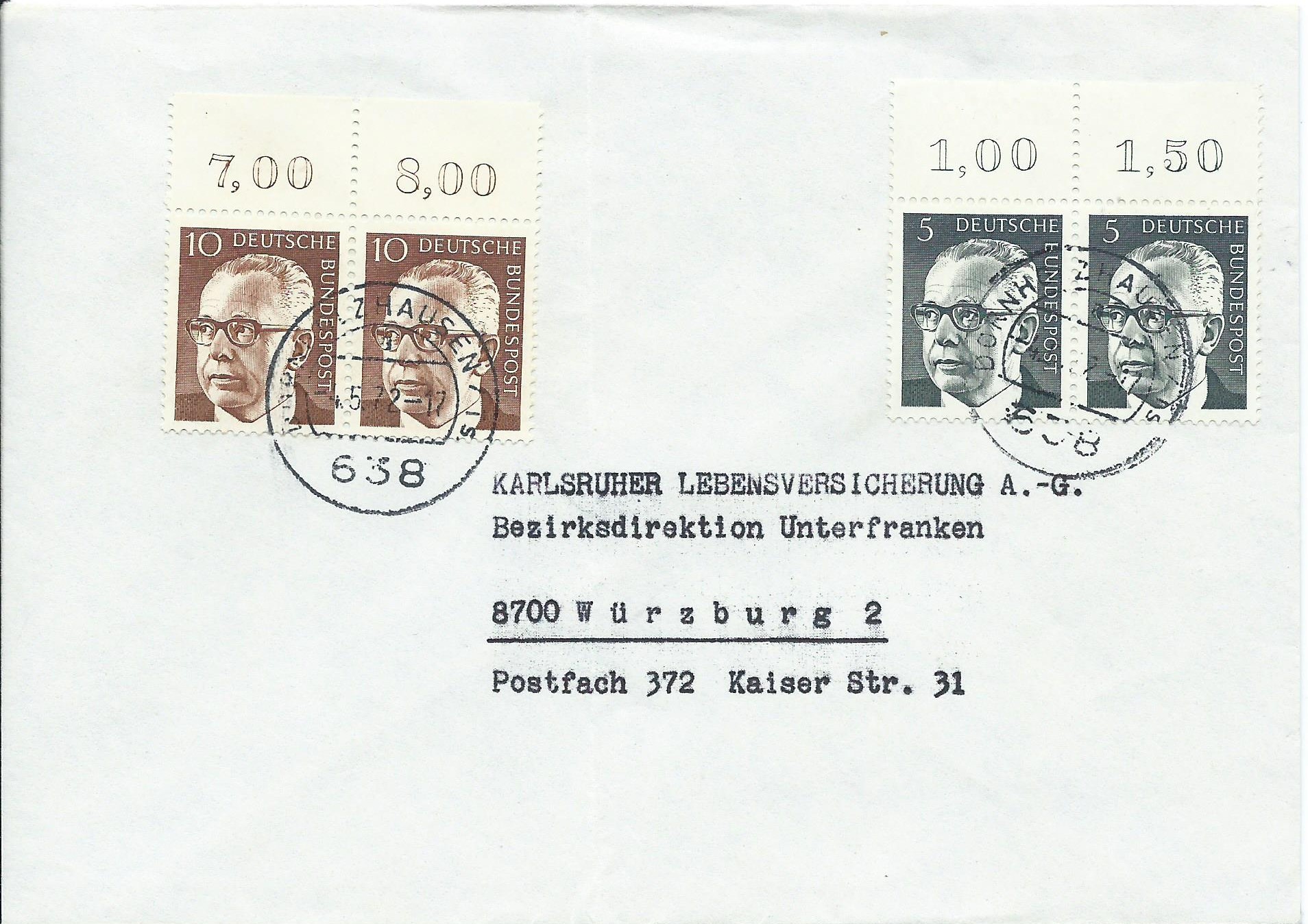 Gefolgt von einer schon Massenfrankatur der 5 Pf-Marke. 20 Marken im Block aus der linken unteren Bogenecke, gestempelt 29.9.95. Hier wurde eindeutig Porto aufgebraucht, da die Ausgabe der Marke (23.7.70) doch schon „etwas“ zurück liegt. Aber trotz der späten Verwendung ein schöner Beleg.