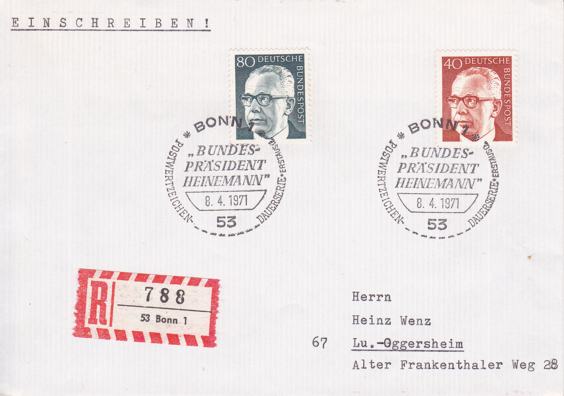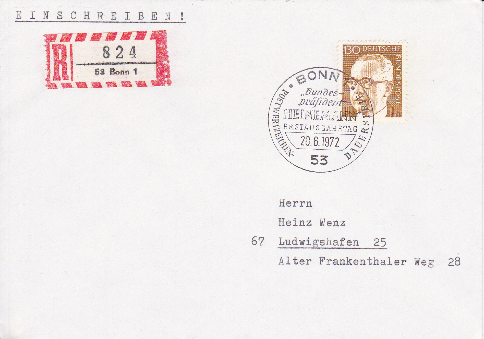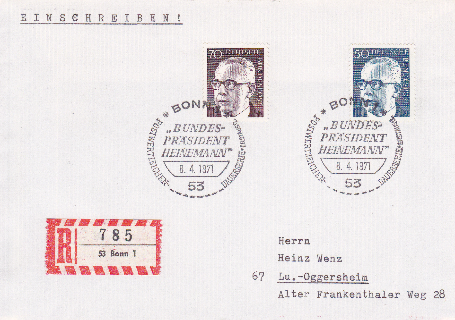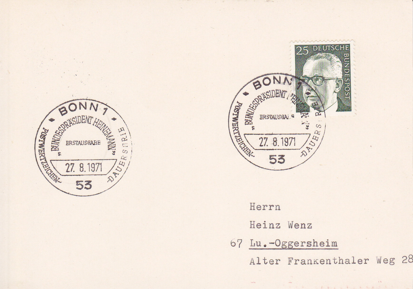 Gefolgt von einer schon Massenfrankatur der 5 Pf-Marke. 20 Marken im Block aus der linken unteren Bogenecke, gestempelt 29.9.95. Hier wurde eindeutig Porto aufgebraucht, da die Ausgabe der Marke (23.7.70) doch schon „etwas“ zurück liegt. Aber trotz der späten Verwendung ein schöner Beleg.