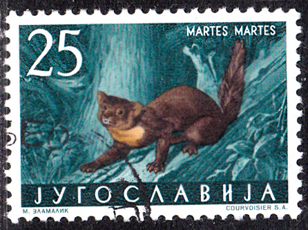 Ein weiterer Baummarder (Martes martes) wird auf dieser Marke aus Jugoslawien (MiNr 919) gezeigt.