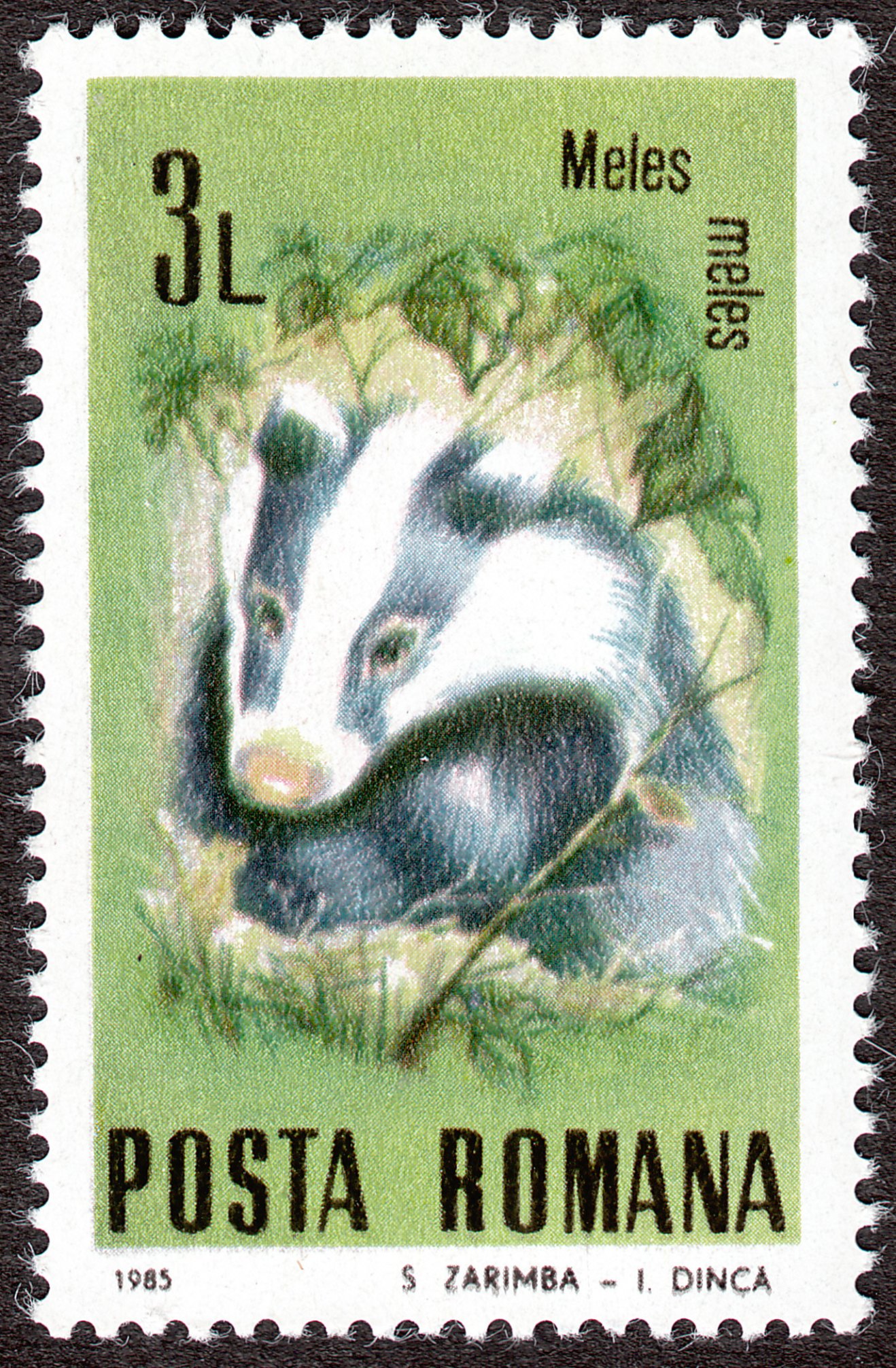 Aus Rumänien stammt dieses Postwertzeichen aus dem Jahre 1985 mit der Darstellung eines Dachses (Meles meles):