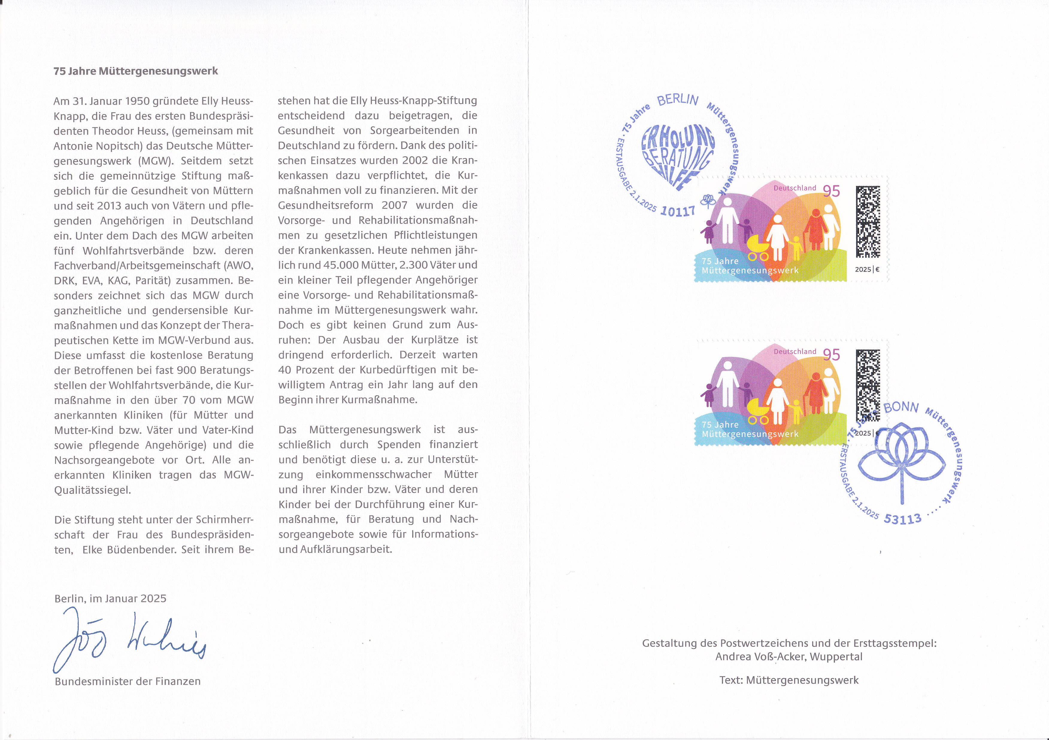 Ministerkarte des Bundesministers für Finanzen mit zwei Marken "75 Jahre Müttergenesungswerk" (MiNr 3881) und den beiden Ersttagsonderstempel Bonn und Berlin.