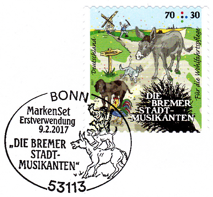 Im Ersttagsonderstempel Berlin zu dieser Ausgabe wird aus diesem Märchen zitiert: " ... ich gehe nach Bremen und werde dort Stadtmusikant ...".