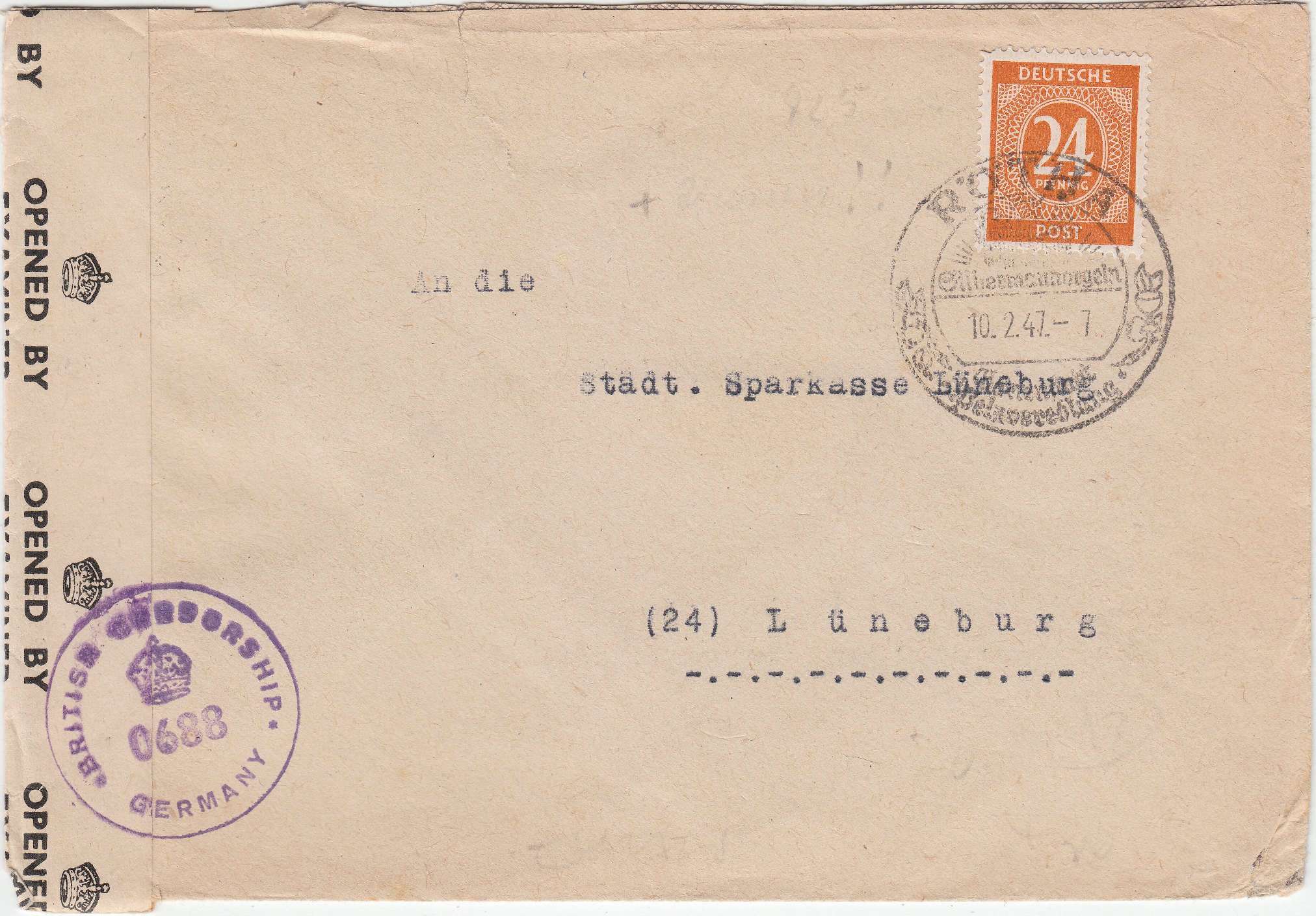 In Deutschland angekommen lief der Brief durch die britische Zensurstelle, wo er linksseitig geöffnet und mit einem Verschlußstreifen "P.C. 90 OPENED BY EXAMINER 4726" wieder verschlossen wurde, was ein vorderseitig abgeschlagener Prüfstempel "BRITISH CENSORSHIP GERMANY 3244" in Violett dokumentiert.