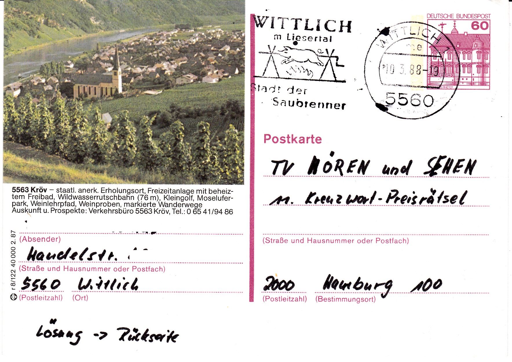 Maschinenwerbestempel vom 19.3.1988 aus Wittlich mit Abbildung eines Schweines am Spieß.