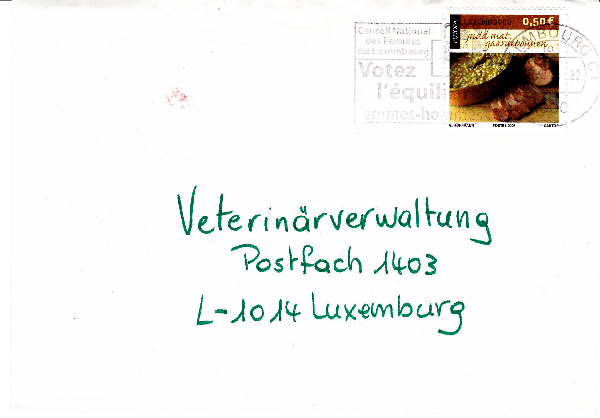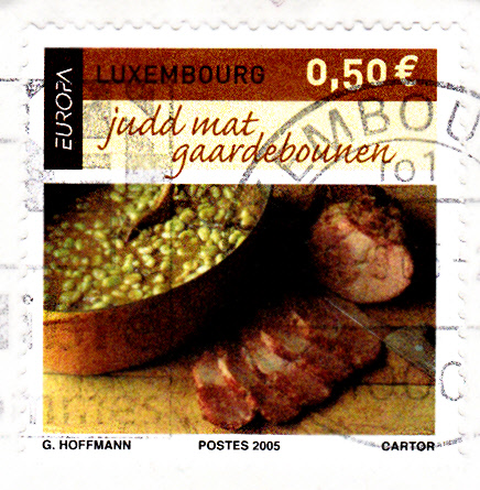 Auf dieser Europamarke aus dem Jahre 2005 (Thema: Gastronomie) wird "Judd mat Gaardebounen" (deutsch: Schweinenacken mit Saubohnen) vorgestellt.