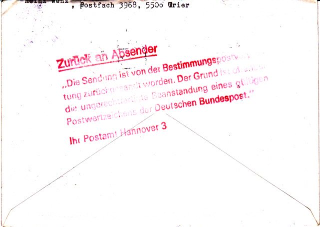 Auch in der DDR erkannte man das Postwertzeichen nicht an und schickte die damit frankierten Briefe zurück. Hier ein Einschreibebrief bis 20 Gramm (Porto 80 Pf + 200 Pf Einschreibegebühr = 280 Pf) portorichtig frankiert mit einem Paar MiNr 1265 und einer Wohlfahrtsmarke 1985 (MiNr 1262). Der Brief erhielt in der DDR einen Stempel "Zurück" und der Bestimmungsort Magdeburg wurde durchgestrichen. Rückseitig wurde vom Postamt Hannover 3 ein weiterer Stempel angebracht, der den Grund der Rückgabe erklärt.