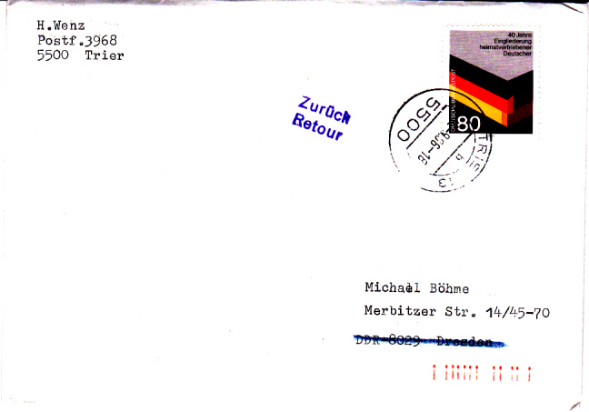 Ein weiterer Brief bis 20 Gramm vom 2.9.1986 von Trier nach Dresden, frankiert mit dem 80 Pfennigwert MiNr. 1265. Bei der Post der DDR erhielt er den Stempel "Zurück Retour" und der Bestimmungsort wurde wie üblich durchgestrichen. Auch hier wurde ein Stempel von der Deutschen Bundespost rückseitig zur Erklärung der Rücksendung angebracht. Dieser Stempel in blau enthält keine Angabe des zuständigen Postamtes.