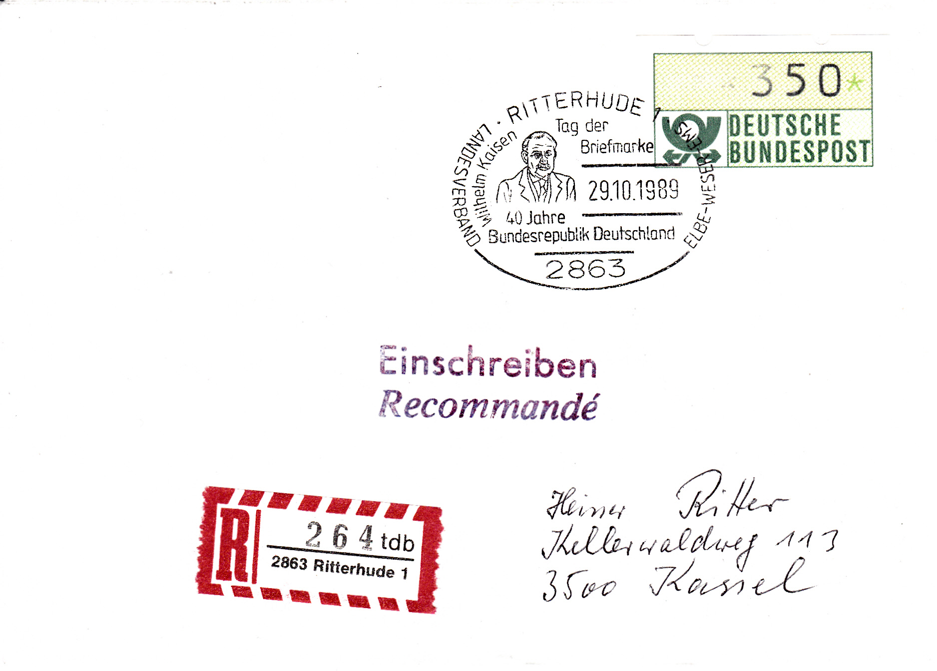 Ganzsachenumschlag zum Tag der Briefmarke 1989 des Verbandes Niedersächsischer Philatelistenvereine e.V. mit dem dazugehörenden Sonderstempel vom 29.10.1989 aus Hannover. Im Stempel wird ein Porträt des ersten