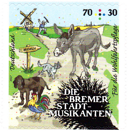 Im Ersttagsonderstempel Berlin zu dieser Ausgabe wird aus diesem Märchen zitiert: " ... ich gehe nach Bremen und werde dort Stadtmusikant ...".