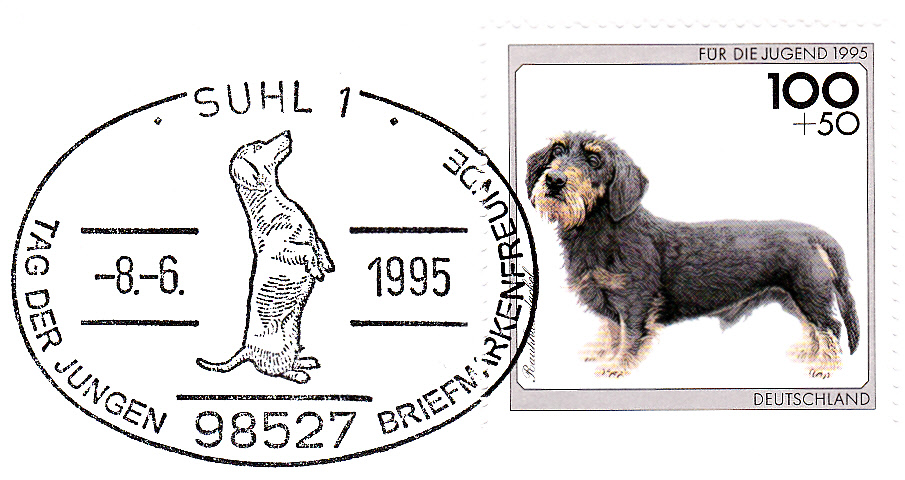 Sonderstempel aus Suhl zum Tag der Jungen Briefmarkenfreunde 1995 vom Ersttag dieser Marke mit einem "stehenden" Kurzhaar Dackel im Stempelbild.