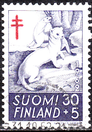 Diese Marke aus Finnland aus einer Zuschlagserie zur "Bekämpfung der Tuberkulose" (MiNr 553) zeigt Hermeline (Mustela erminea).