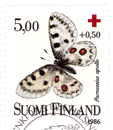 Diese Marke aus Finnland (MiNr 995) zeigt auch einen Apollofalter (Parnassius apollo).