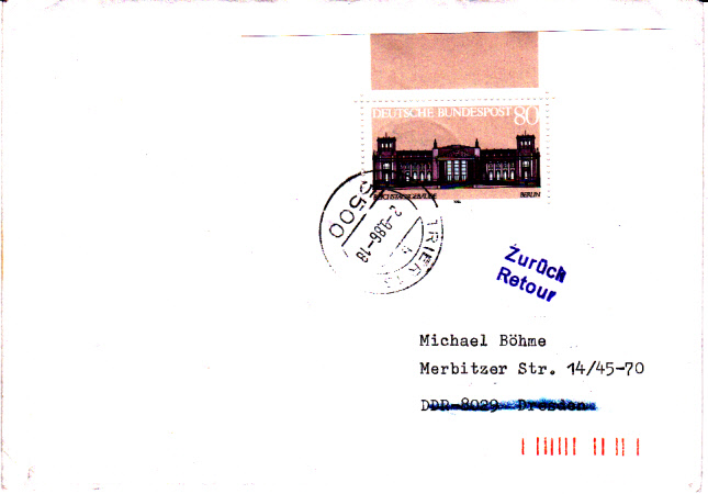 Hier ein Brief vom 2.9.1986 von Trier nach Magdeburg. Auf der Vorderseite wurde in der DDR der Stempel "Zurück" angebracht und der Bestimmungsort durchgestrichen. Rückseitig sehen wir einen Stempelabdruck des Postamtes Hannover 3, der die Rücksendung des Briefes erläutert.