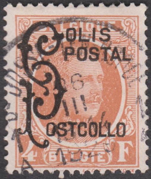 Die Freimarke "König Albert I." der Wertstufe 5 F in der geänderten Farbe grauocker wurde mit einem schwarzen Aufdruck "COLIS / POSTAL / POSTCOLLO" versehen.