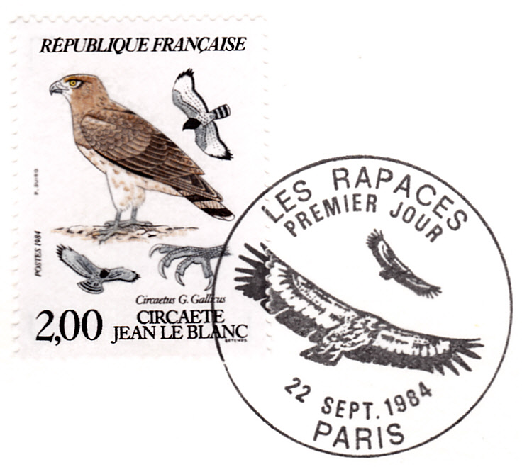 Auch in Frankreich ist in einer Serie "Greifvögel" eine Marke (MiNr 2464) mit einem Schlangenadler (Circaetus gallicus) erschienen. Hier zeige ich ein Marke vom rechten oberen Bogenrand.