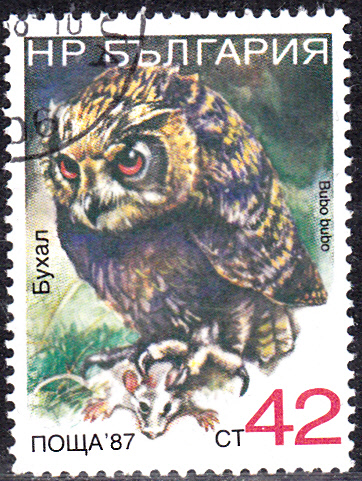 Auf einer Marke aus Bulgarien (MiNr 3694) wird ein Uhu (Bubo bubo) mit seiner erbeuteten Maus gezeigt.
