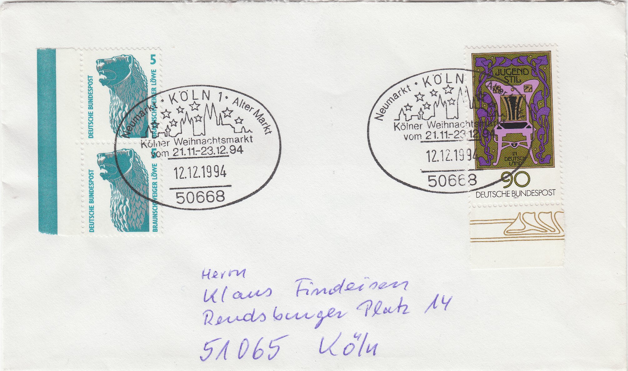 Die Weihnachtsmärkte in Köln auf dem "Neumarkt" sowie dem "Alter Markt" haben lange Tradition und sind weltberühmt. Hier ein Sonderstempel vom 12.12.1994 auf einem Standardbrief (110 Pf) frankiert mit einer interessanten Mischfrankatur, den ich beim heutigen Vereinstauschtag in Köln ergattern konnte: