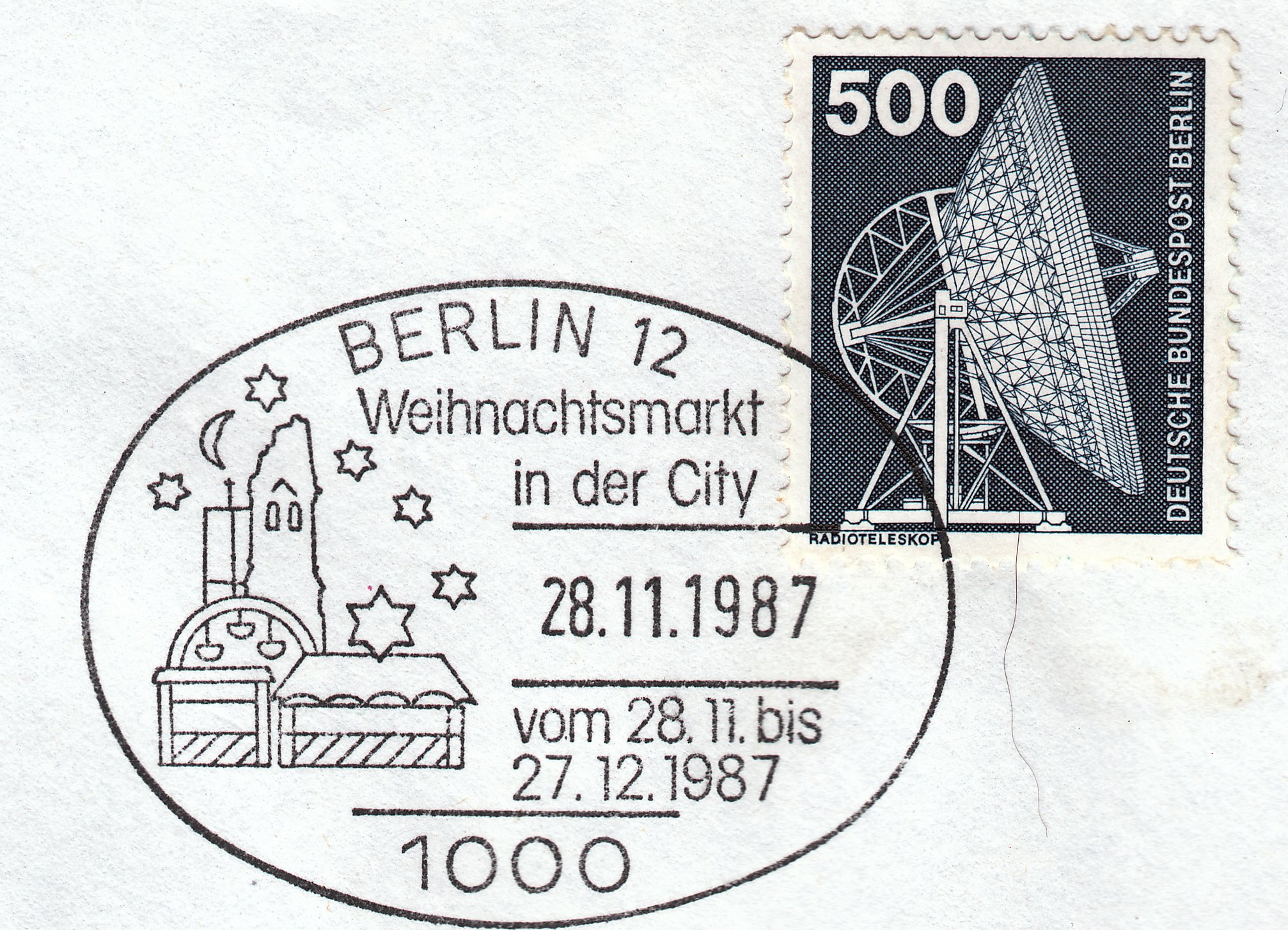 Hier war jemandem ein Sonderstempel vom Weihnachtsmarkt in der City von Berlin am 28.11.1987 doch glatte 5 DM an Porto wert: