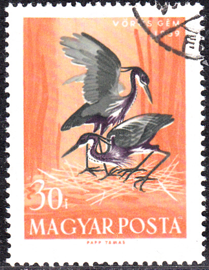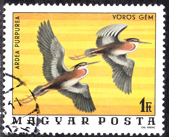 Es fogt eine weitere ungarische Marke mit dem Purpurreiher (Ardea purpurea). Diese Marke (MiNr 3173 A) zeigt zwei fliegende Exemplare.