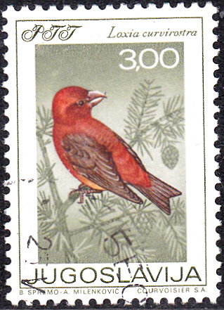 Hier eine Marke aus Jugoslawien (MiNr 1278) mit einem Fichtenkreuzschnabel (Loxia curvirostra).