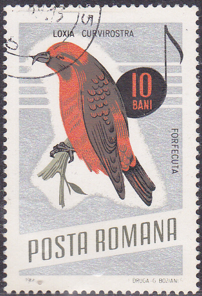 Aus Rumänien kommt diese Marke (MiNr 2501) mit einem Fichtenkreuzschnabel (Loxia curvirostra).