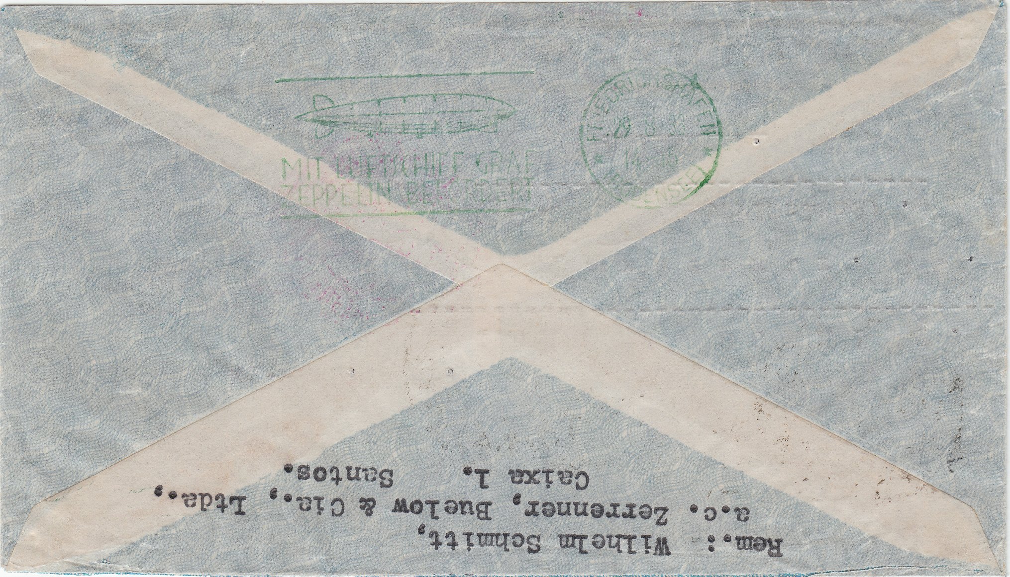 Dieser Brief wurde bei der brasilianischen Post als Zuleitungspost zur 5. Südamerikafahrt des Luftschiffes Graf Zeppelin in Sao Paulo aufgegeben und erhielt vorderseitig einen Bestätigungsstempel in Violett: