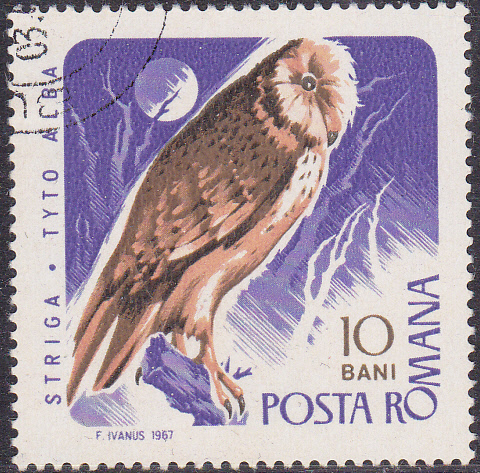 Aus einer rumänischen Serie "Eulen und Greifvögel" kommt diese Marke (MiNr 2568) mit einer Schleiereule (Tyto alba).