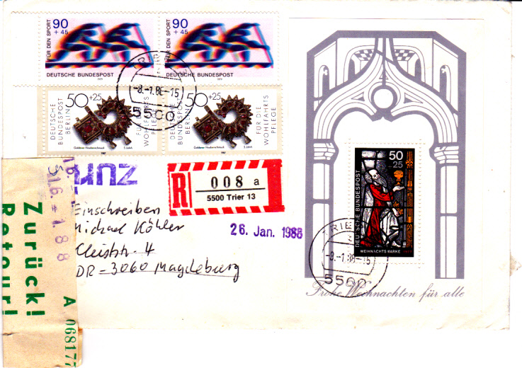 Dieser Brief der Gewichtsstufe 21 bis 50 Gramm (Porto 130 Pfennig) wurde am 8.1.1988 in Trier per Einschreiben (Einschreibegebühr 200 Pennig) portogerecht mit 330 Pfennig frankiert nach Magdeburg aufgegeben. In der DDR wurde er auf der linken Seite geöffnet und mit zwei Klebestreifen (eine Art Tesafilm) wieder verschlossen. Zum Inhalt gehörten Briefmarken, deren Einfuhr in die DDR nicht zugelassen war. Er wurde deshalb mit einem "Zurück" Stempel versehen und ein Aufkleber "Zurück! Retour! Inhalt verstößt gegen Ziffer 111 der "Liste der verbotenen Gegenstände" wurde am linken Rand aufgeklebt. In Trier wurde dann die Postfachanschrift des Absenders rückseitig ergänzt und eine Benachrichtigung zur Abholung ins Postfach gelegt. Vorderseitig wurde das Ende der Lagerfrist mit Datumstempel "26. Jan.1988" aufgestempelt.