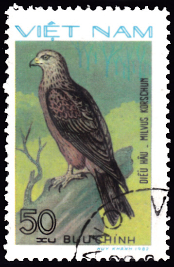 Auf dieser Marke aus der Volksrepublik China (MiNr 2105) wird die Unterart Celebes-Schwarzmilan (Milvus migrans affinis) gezeigt.
