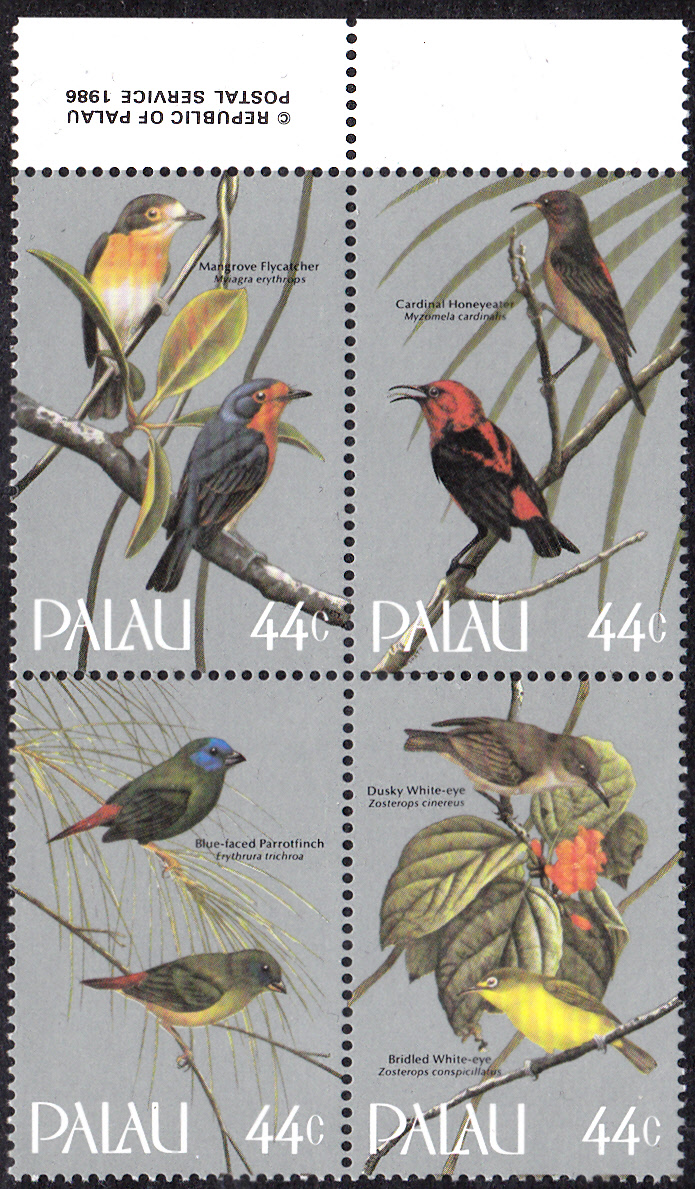 Auf dieser Marke der Palau-Inseln (MiNr 104) sehen wir oben laut Inschrift auf der Marke einen "dusky white-eye". Der lateinische Namen wäre "Zosterops finschii". Angegeben ist auf der Marke aber "Zosterops cinereus". Unter diesem lateinischen Namen ist aber der deutsche Namen Kittlitzbrillenvogel (Zosterops cinereus) zu finden. Andere Quellen nennen unter dem lateinischen Namen "Zosterops finschii" den Palau-Brillenvogel. Der Michel-Katalog nennt den gezeigten Vogel "Graubraunbrillenvogel (Zosterops cinerea)". Nun kann sich jeder den passenden Namen aussuchen!