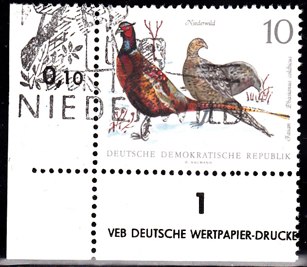 In der DDR ist 1968 eine Markenserie zum Thema "Niederwild" erschienen. Eine der Marken zeigt ein Pärchen des Jagdfasanes (Phasianus colchicus). Hier eine Marke vom unteren linken Bogenrand mit einem Teil des Druckvermerkes.