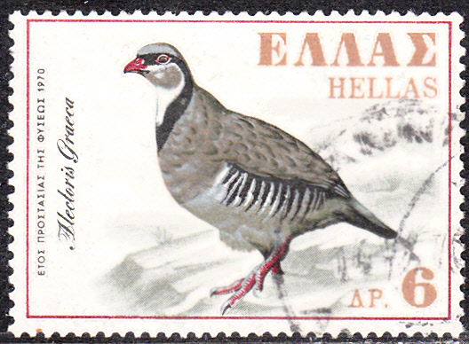 Ein Steinhuhn (Alectoris graeca) zeigt diese Marke (MiNr 1051) aus der griechischen Serie zum Europäischen Naturschutzjahr 1970.