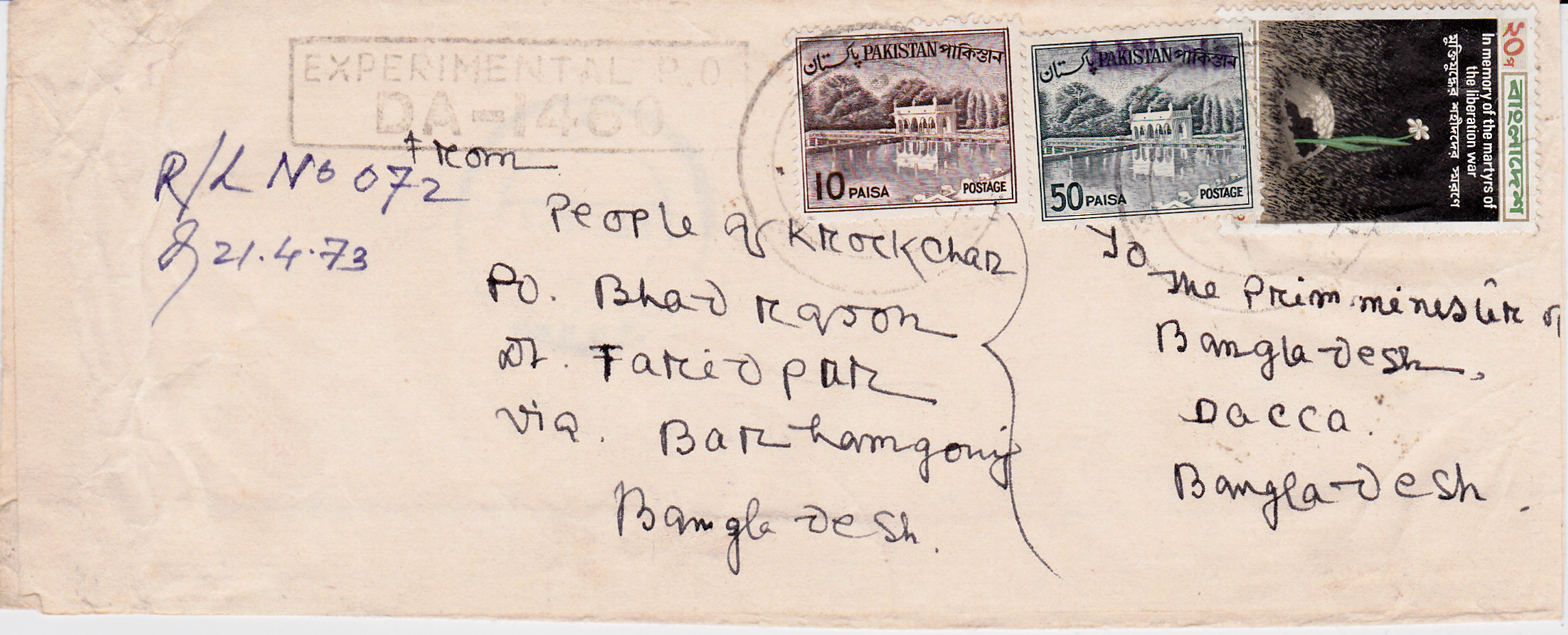 Der abgebildete Ganzsachenumschlag aus Bangladesch (Werteindruck 20 Paisa für einen Standardbrief) ist an Sheikh Mujibur Rahman, Prime Minister, Dacca adressiert. Sheikh Mujibur Rahman wurde am 17. März 1920 im Dorf Tungipara im Distrikt Gopalganj geboren. Er gilt als Initiator der Unabhängigkeit Bangladeschs.