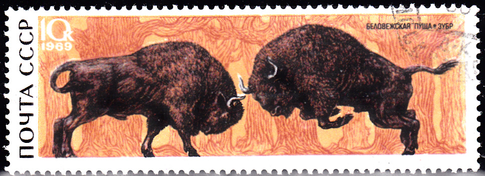 Auf dieser Marke aus der Sowjetunion (MiNr 3669) wird einer der ausgesprochen seltenen Kämpfe zwischen zwei Wisentbullen dargestellt.