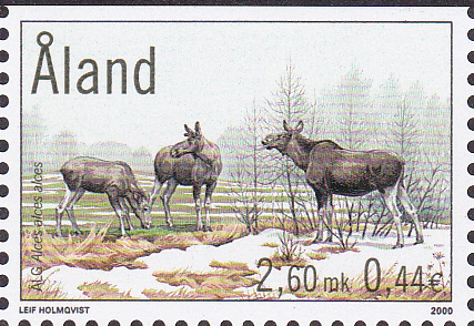 Auf dieser Marke der Åland-Inseln (MiNr 171) sind drei Elchkühe der Unterart Europäischer Elch (Alces alces alces) abgebildet.