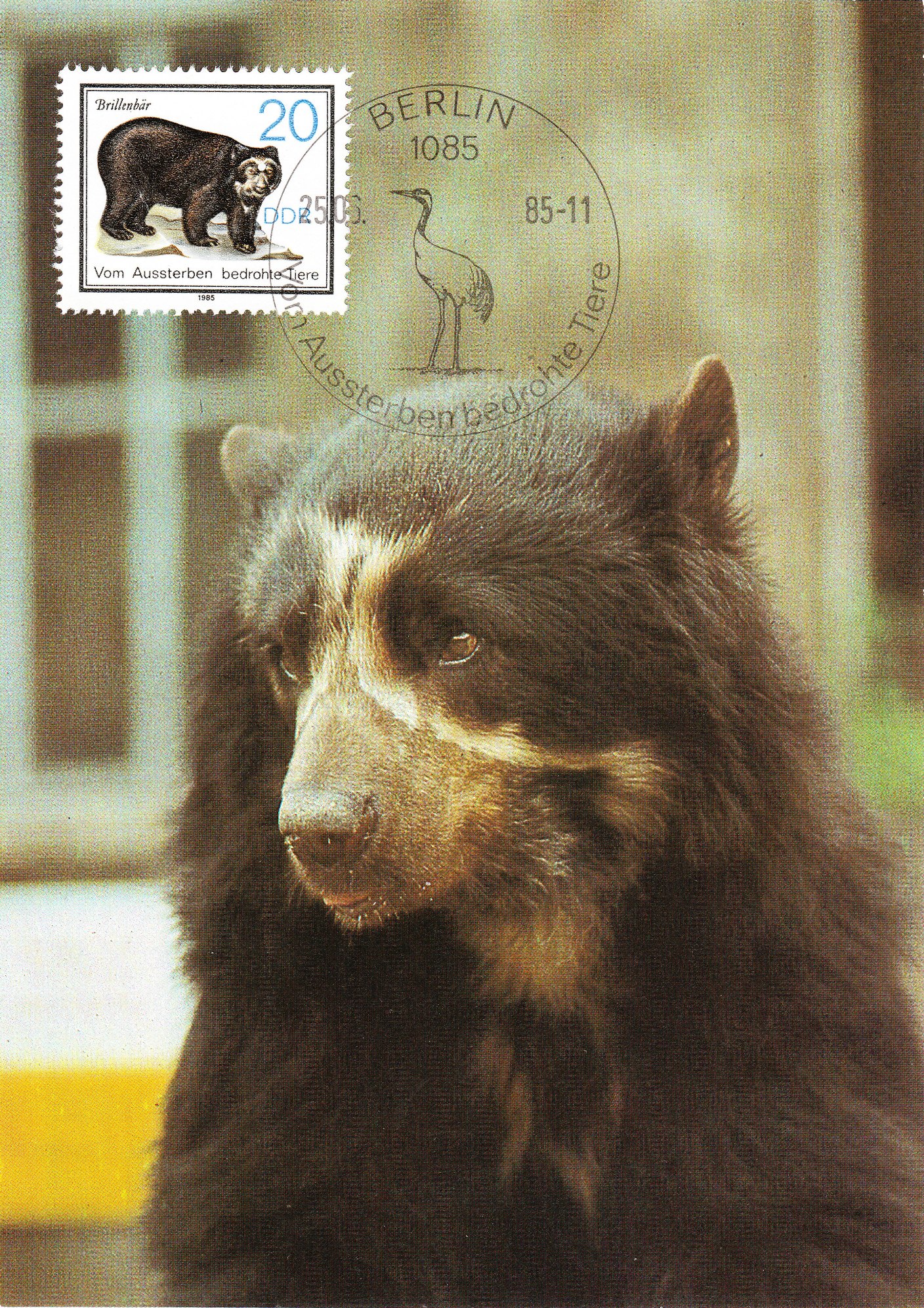 Diese Maximumkarte aus der DDR, MiNr. 2954, zeigt das Motiv Brillenbär = Tremarctos omatus als vom Aussterben bedrohtes Tier: